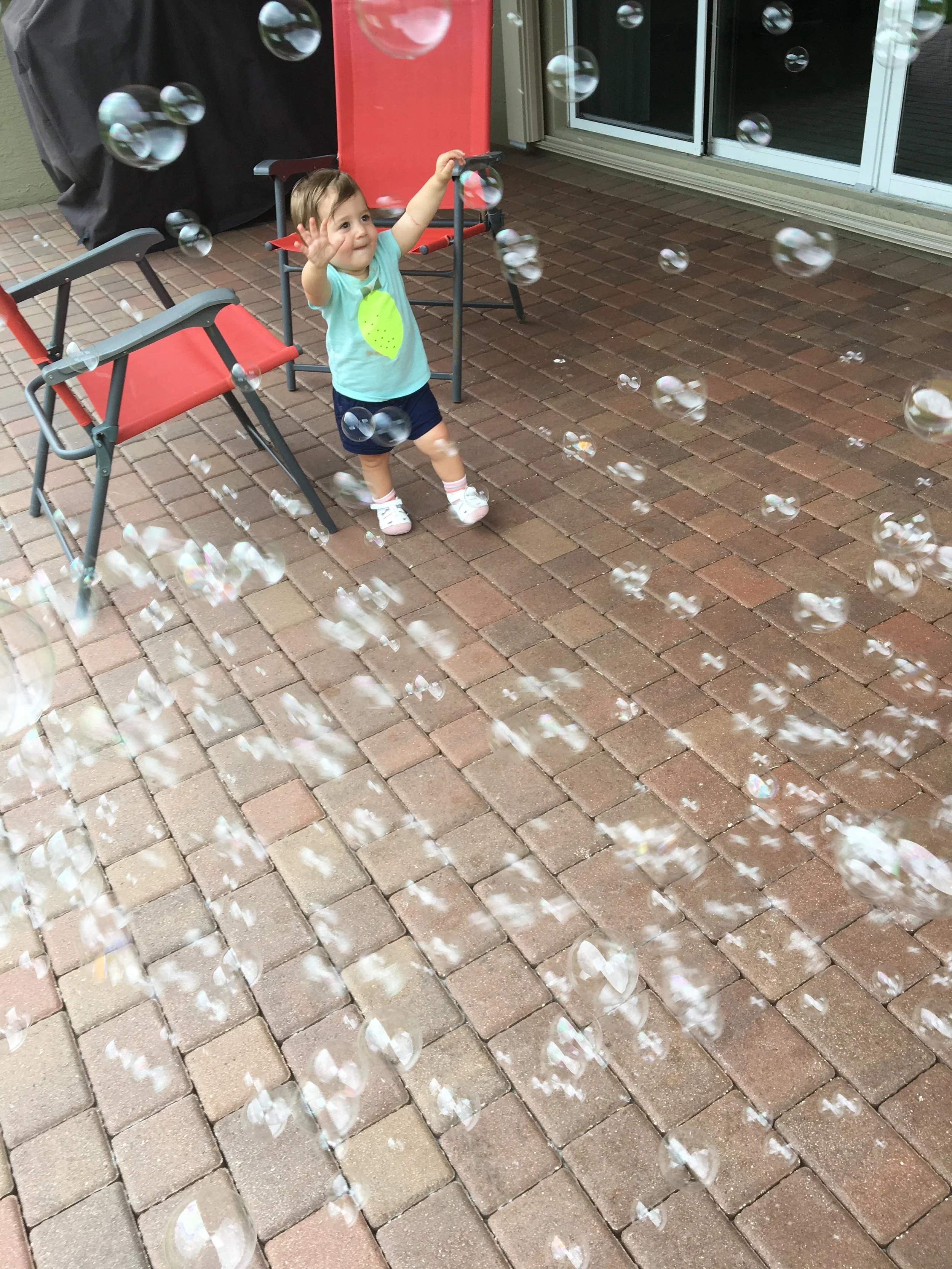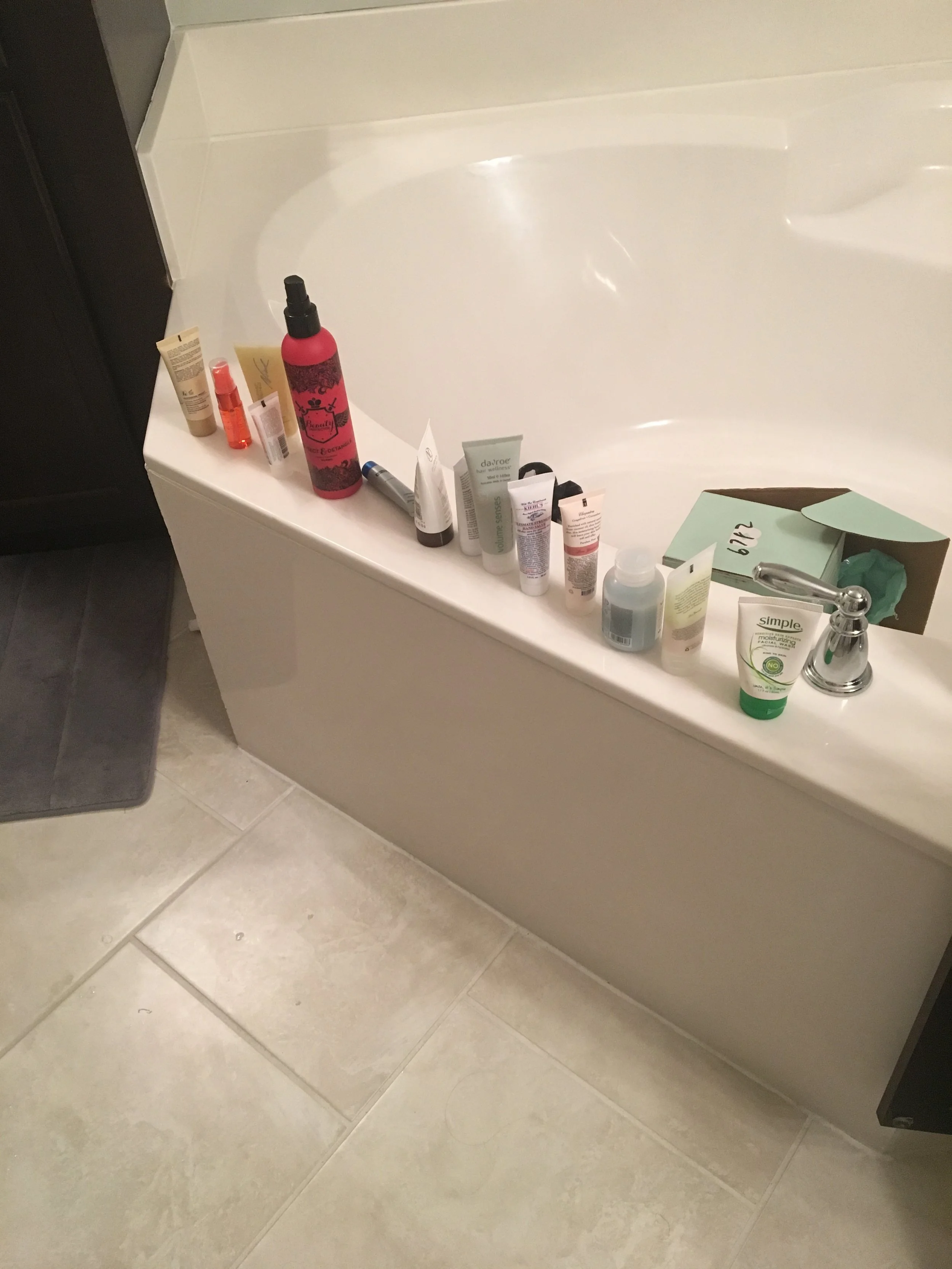 She's also taken to stacking and lining up different items around the house. Her favorite is taking out shampoo, conditioner, and soap bottles and putting them on the side of the tub or on the shelf in the shower. It's weird.